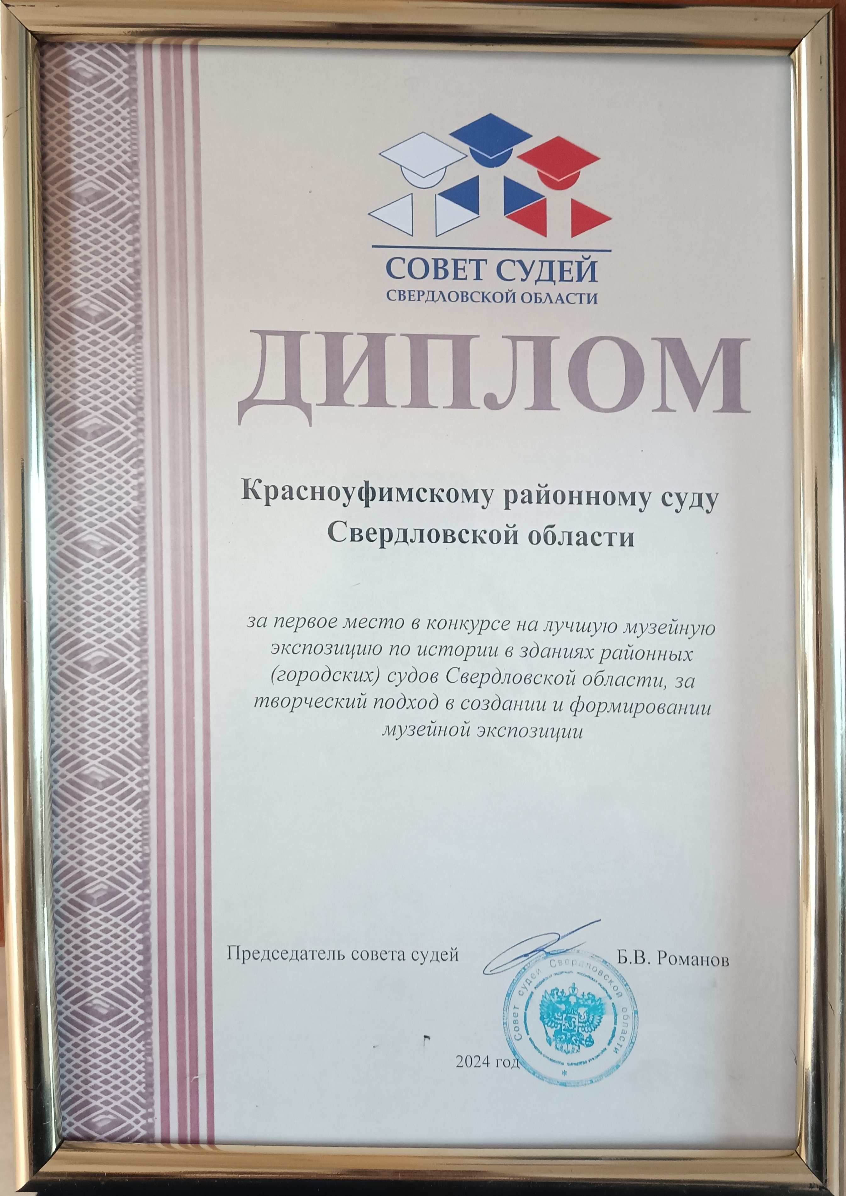 Советом судей Свердловской области Красноуфимский районный суд награжден дипломом за первое место в конкурсе на лучшую музейную экспозицию по истории в зданиях районных (городских) судов Свердловской области, за творческий подход в создании и формировании музейной экспозиции. Музей расположен в постоянном судебном присутствии в р.п. Ачит Красноуфимского районного суда. ![]() |